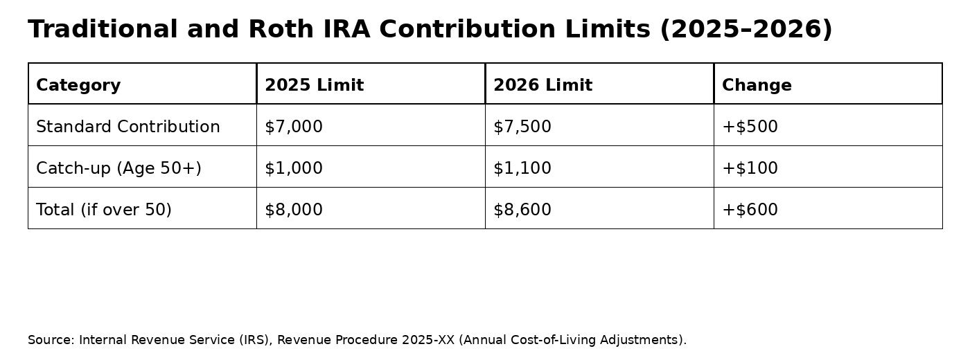 The annual contribution limit for IRAs (both Traditional and Roth) has seen a modest increase for 2026 to keep pace with inflation.